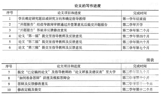 (7)論文進度。論文寫作進程表,要按時間順序分階段列出(見表)。