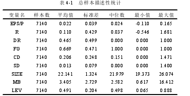從表 4-1,對總樣本進行描述性統計分析,EPS/P 的均值(0.022)小于其中位數(0.024),說明盈余的分布是左偏,而 R 的均值(0.110)大于其中位數(0.037),說明股票收益率的分布是右偏,盈余左偏和股票收益率右偏符合會計穩健性的特征,即確認損失比確認收益更加及時。R 的標準差(0.429)遠大于 EPS/P 的標準差(0.039),說明市場波動率大于會計收益變動率;DR 的均值為 0.465,說明超過半數的上市公司股票收益率為正值。FG 的均值為 0.669,說明 66.9%的上市公司進行了現金股利的分配;CD 的均值為 0.206,說明我國上市公司平均現金股利支付率水平較低。對于控制變量來說,公司規模 SIZE 的最大值(26.074)與最小值(19.373)的相差較大,且標準差(1.324)較大,說明可以較好的控制公司規模對會計穩健性的影響;權益市賬比 MB 的平均值為 3.405,標準差為2.729,表現出良好的差異性,能夠較好的控制權益市賬比對會計穩健性的影響;資產負債率 LEV 的最小值(0.065)和其最大值(0.888)有一定的差異,可以控制資產負債率對會計穩健性的影響。