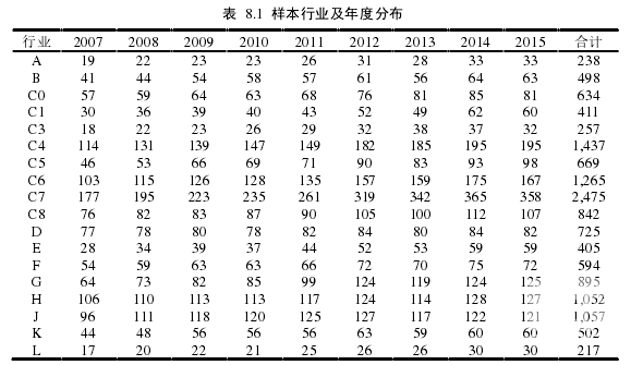 本章選取了 2005 至 2015 年的 2996 所滬深 A 股上市公司的年度財務報告數據為研究對象。對應分析師跟蹤數據為滯后變量,且由于數據可獲取性,選取的相應時間段為 2004-2014年。對樣本篩選的具體步驟如下:①剔除金融、保險業公司 58 家,由于金融相關行業的財務業績等計算具有行業特殊性,與其他行業區別較大,因此將其從樣本中剔除;②剔除首年上市公司、已退市公司、創業板公司 696 家,創業板及已退市公司在融資動機及業績獎勵計劃等方面與主板及中小板公司存在較大差異,而首年上市公司由于缺少前一期數據,因此將此類樣本公司剔除;③剔除重要財務數據缺失樣本;④刪除分析師相關跟蹤數據缺失個觀測值。剩余研究樣本包含 16,888 個公司-年度觀測值。上市公司財務報表數據來自國泰安CSMAR 數據庫,分析師相關數據來自萬得 WIND 金融數據庫。數據篩選和處理應用 STATA 13.0 軟件。本文按照中國證監會《上市公司行業分類指引》(2001)的一級代碼對于行業進行劃分,研究樣本的行業-年度分布如表 8.1 所示。但在數據分析時,對于制造業,按照研究慣例細分至二級代碼,因此樣本觀測值所處行業共涉及到19 個。