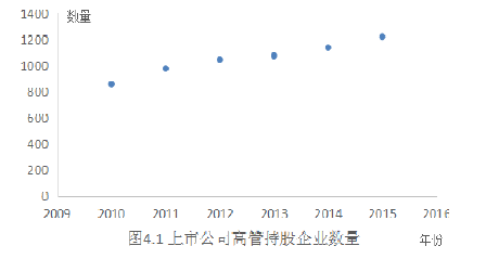 代理問題扭曲投資行為不僅多年來困擾著國內外著名學者,同時公司所有者也會因為代理人對私利的執著而苦于無法有效監督。然而,企業所有者們漸漸意識到,若使企業的總經理、副總經理等這些高管們持有公司股份,使股東與代理人成為利益共同體,那么在一定程度上應該可以降低代理成本,改善公司治理,通過修正投資行為來維護公司價值。越來越多的企業所有者意識到高管持股的重要性,圖 4.1 是本文所研究的樣本中歷年高管持股的企業數量,呈逐年增多的趨勢。盡管公司的所有者們都意識到高管持股激勵的重要性,但是不同的行業對這個激勵機制的執行力度并不相同,對高管持股分行業做了描述性統計,結果如表 4.1。我們發現,在制造業這個行業,高管持有股份的公司樣本數量最多,這可能與制造業占 A 股上市公司的比重較大有關系;相比之下,教育行業實施高管持股激勵的公司最少,在 2010-2016 年這個時間段僅有 6 家,這或許因為國內上市的教育類企業過少,與教育事業這個行業的特殊性相關。信息傳輸、軟件和信息技術服務業以及農林牧漁業的數據平均值與方差都較大,說明高管持股在這兩個行業的推行力度是很大的,但是在不同企業的高管持股激勵強度不同。