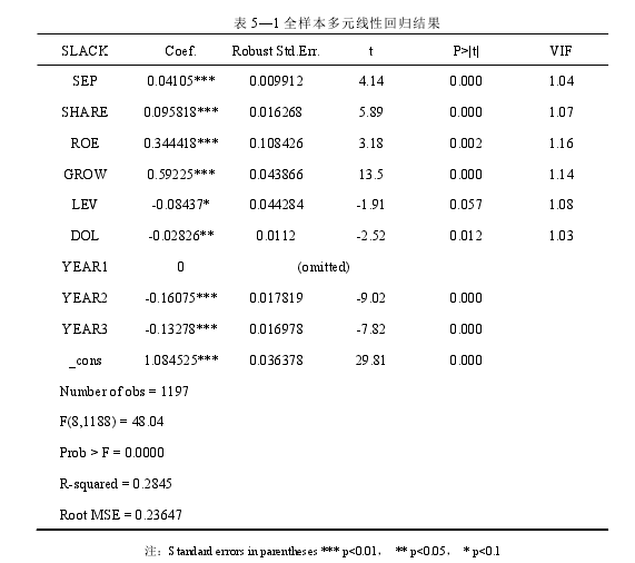 為驗證假設 1,采用全樣本對模型進行多元線性回歸分析的結果具體如下圖所示的表 5—1。 由表 5—1 可以看出,數據經過篩選共有 1197 家符合要求,使用全樣本對模型回歸時該模型的 F 值為 48.04,在 1%的水平上顯著,R2為 0.2845,說明模型中各解釋變量和控制變量對被解釋變量預算松弛的解釋力較強。模型中各主要變量的方差膨脹因子系數 VIF 均小于 2,這表明,在模型中各個主要解釋變量之間的相關性較小,變量之間不存在多重共線性,模型多元線性回歸分析的結果較為真實可靠。兩權分離 SEP 的回歸系數為 0.04105,且在 1%的水平上顯著正相關,這代表在其他條件一定的情況下,兩權分離度越高預算松弛就越高,這與我們的假設 1 一致,即可驗證假設 1??刂谱兞恐衅髽I性質 SHARE 這一變量回歸系數為 0.095818,在 1%的水平上顯著正相關,也就是說,與非國有企業相比,國有企業的預算松弛會更大。這與之前眾多學者的研究是相同的。企業的凈資產收益率 ROE 與企業的成長性 GROW 的回歸系數均為正且都與預算松弛在1%的水平上顯著。即企業業績越好或企業處在成長階段時,預算松弛會越大,這也是和之前學者研究的結論是相同的。企業的資產負債率 LEV 與企業的經營杠桿系數 DOL的回歸系數均為負,企業資產負債率 LEV 在 10%的水平上顯著,企業的經營杠桿系數在 5%的水平上顯著??梢哉f企業的資產負債率越高或者經營風險越高,預算松弛水平越低.