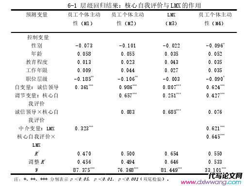 本研究在已有中介模型基礎上進一步考慮個體因素的影響,將核心自我評價引入中介模型中,探索核心自我評價對誠信領導與員工個體主動性關系的調節作用,并進一步探索核心自我評價對中介效應的調節作用,即構建一個有調節的中介模型,并對其進行驗證。基于領導-成員交換(LMX)在誠信領導與員工個體主動性關系中存在中介效應,本研究擬進一步考察領導-成員交換的中介效應是否受到員工核心自我評價的調節。有調節的中介效應成立的前提是中介作用的總效應成立,且自變量與調節變量的交互作用對因變量不產生影響。在滿足此前提的情況下,研究采用 Muller 等提出的驗證有調節的中介效應方法,建立以下 3 個回歸方程來驗證有調節的中介效應。根據以上 3 個回歸方程式來判定有調節的中介效應成立。第一,誠信領導與核心自我評價的交互作用對領導-成員交換有顯著影響,即 a23、a34 顯著;第二,誠信領導與領導-成員交換的交互作用對員工個體主動性有顯著影響,即 a21、a35 顯著;第三,誠信領導與核心自我評價的交互作用以及核心自我評價與領導-成員交換的交互作用同時對員工個體主動性產生顯著影響,即 a23、a34、a21、a35 均顯著。依據上述步驟,首先,以誠信領導、核心自我評價及其交互作用作為預測變量,以員工個體主動性作為因變量進行回歸分析,檢驗誠信領導與員工個體主動性關系是否受到核心自我評價的調節。結果發現,核心自我評價誠信領導對員工個體主動性有顯著的正向預測作用(β=0.986,p<0.001),而核心自我評價對員工個體主動性具有顯著的負向預測作用(β= 0.657,p<0.001),誠信領導與核心自我評價的交互作用項進入回歸方程后,對員工個體主動性沒有產生顯著影響(β=0.083,p>0.05) ,詳情見表 6-1。
