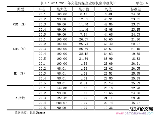 從表 4-1 的統計結果來看,所統計的 44 家文化傳媒企業的 CR1 在從 2011 年到 2015 年的最大值幾乎無變化,但可以看出由以前 100%控股的局面向分散型股權轉變,但不明顯,其次其最小值在 2012 年獲得大幅增加后開始不斷遞減,而總體均值也在 2012 年的大幅增加后出現遞減。而 CR5 的最大值幾乎無變化,最小值在 2012 年和 2013 年遞減后,于 2014 年出現大幅度增長.其均值總體來看也呈下降趨勢。對于 H 指數來說,本文選取的是第一大股東的數據即 H1,其目的就是為了表示第一大股東持股的離散程度,可以看出其最大值在 2012 年下降到98.01%以后,就沒有變化過,而其最小值在五年內也出現了小幅度的減少,總體均值來看呈下降趨勢。Z 指數是反映了股權的制衡程度越大說明其股權越集中,第一大股東對其他人的制衡程度就越高,從表內數據反映出,Z 指數的總體變化都趨于下降。總而言之,觀察我國 44 家文化傳媒企業的股權集中程度的相關指標發現,2011 年到 2015 年間我國文化傳媒上市企業的股權集中度下降。