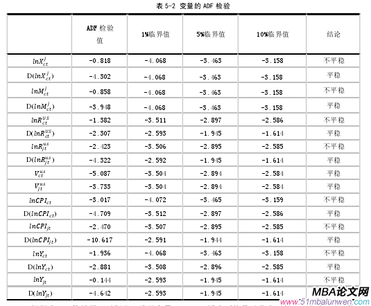 VAR 模型就是向量自回歸模型,很多學者在研究經濟問題時習慣使用 VAR 模型。因為VAR 模型研究的是不同變量之間的相關關系,他不需要復雜的理論基礎做支撐。具體來說,VAR 模型采取的是多方程聯立的形式,在模型的所有方程中,他將每一個變量都視為內生變量處理,用內生變量對自身模型的全部內生變量的滯后值進行回歸,從而可以更加清楚明了地估計匯率與進出口貿易之間的動態關系。而且因為 VAR 模型不受到經濟理論基礎的束縛,對于解釋變量可以酌情增減,這也拓寬了學者的研究思路,使得實證研究更加的簡單易懂。引力模型作為經驗模型在最開始的時候并沒有強有力的理論依托,但是經過二十多年的發展,學者發現了很多的理論框架為引力模型的推導打下了理論基礎。具體來說:基于自由市場的比較優勢理論、基于壟斷競爭的新貿易理論和基于要素稟賦的 H-O 理論等貿易理論,都可以獨立推導出某種形式的引力方程。而本文的引力模型是建立在供求模型的微觀基礎上延伸出來的,這種方法在國內外被大量學者使用。根據中日雙邊貿易的實際情況,本文在原有的引力模型基礎上也做了修正。由于媒介貨幣的引入,作者將不使用人民幣兌日元的直接匯率,而是將人民幣兌美元匯率、日元兌美元的匯率引入解釋變量中去,同時加入匯率波動率變量。再加入兩國的國民收入變量和人均國民收入變量,居民消費價格指數變量。除此之外再引入我們前文提到的影響雙邊貿易的虛擬變量-匯率制度改革和加入 WTO。在這些變量的基礎上作者分別通過進口和出口兩個模型分別進行研究。當然變量的增多可能導致完全共線性的問題,因此筆者將對數據進行相關性分析,將具有完全共線性的變量剔除掉。在計量方面,作者選擇了最新的 Eviews7.2 的計量軟件進行分析。先進行平穩性檢驗,時間序列數據一般存在不平穩的現象。如果變量經差分后可以達到同階單整,那么用 E-G 兩步法對變量進行協整檢驗,觀察各個解釋變量對被解釋變量的影響程度。然后在協整的基礎上做出誤差修正模型,分析變量短期之間是否存在均衡關系。