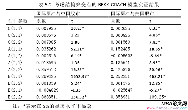 國際原油市場與中美股票市場在過去數十年年間的發展中,由于受到國際金融市場和國內政治、經濟和社會環境等影響,原油價格和股價時間序列的數據生成過程產生了結構性變化。表 5.2 給出了帶結構突變點的 BEKK-GRACH 模型的估計結果。在表 5.2 中,參數 A(1,2)、B(1,2)、A(2,1)和 B(2,1)是用來判斷國際原油市場與上證綜合指數即中國股市、國際原油市場與標普 500 指數即美國股市間有無波動溢出效應的指標。其中,參數 A (1,2)和 B(1,2)衡量的是國際原油價格波動率對股票市場波動率的溢出效應,參數 A(2,1)和 B(2,1)衡量的是股票市場波動率對國際原油價格波動率的溢出效應。若參數 A(1,2)、B(1,2)、A(2,1)和 B(2,1)均顯著為零時,說明不存在國際原油市場到股票市場的波動溢出效應,反之若顯著不為零,說明兩個市場間存在波動溢出效應。其中,參數 A(1,2)和參數 A(2,1)衡量了跨市場波動傳遞效應;參數 B(1,2)和參數 B(2,1)衡量的是跨市場間價格波動持續性的相互影響程度。