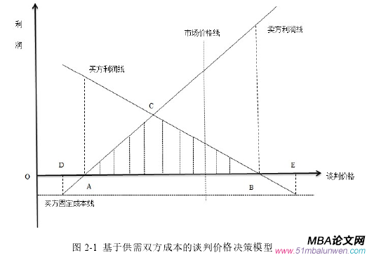 影響談判價格的因素有:供需雙方成本水平、市場價格水平、供給狀況、需求狀況等,其中最重要的因素是供需方成本。談判價格決策模型介紹了供需雙方各自的盈虧平衡點及如何實現供需雙方“共贏”的局面,為逆向定價模型的建立及逆向定價模型倡導的“共贏”與“可持續發展”提供了理論基礎?;诠┬桦p方成本考慮的價格決策模型建立過程如下:首先,估算買方的全成本。核算買方的制造成本、財務費用和附加稅。其次,估算賣方的全成本。前往供方現場進行調查,一方面核實其生產及權證的真實性、合法性和有效性,另一方面,根據生產工藝、生產狀況、當地勞工成本等估算其制造成本。在分別估算了買方和賣方成本的前提下,根據現貨市場價格和價格走勢預測,測算出買賣雙方的利潤曲線,繪出談判價格決策模型,如圖 2-1 所示:由圖 2-1 所示,作為買方,隨著談判價格的上升,利潤空間呈下降趨勢。作為賣方,隨著談判價格的上升,利潤空間逐漸增加。兩條利潤線與談判價格線相交形成的區域為買賣雙方的利潤區間,即從 A 到 B 為買賣雙方價格談判區間。點 A 為賣方的價格接受下限,為賣方的盈虧平衡點。點 B 為買方的接受價格上限,為買方的盈虧平衡點。如果兩線不能相交與價格線形成一個區域,則買賣雙方不能實現雙贏,除非考慮非成本因素,否則談判成功的可能性微乎其微。賣方的成本加成法得出的價格,與買方成本加成法所得價格多大程度上取得一致,達到所謂“雙贏”,便形成了雙方都可接受的價格區間,在這個區間內雙方價格達成一致,買賣方均有利可圖。但價格越接近 A 點,賣方利潤空間越小,越接近 B 點,買方利潤空間越小。在 AB 區間內,通過優秀的采購經理與供應商的博弈,依據不同的市場競爭環境、供貨周期、供貨數量等因素,可以為采購方獲取更多的利潤空間。買賣雙方博弈,充分的談判準備和技巧有助于爭取更多的利潤空間。