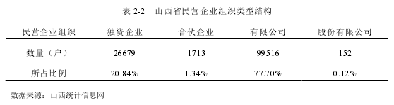 近年來,山西省民營企業在國家宏觀經濟政策與地方經濟政策的引導下,努力調整產業結構,實現企業的轉型跨越,積極利用我省的政策和技術優勢,打造新能源和工業基地,促進了山西省經濟快速發展。民營企業注冊數量占山西省注冊登記企業總數的比重達 77%,民營經濟貢獻總量占地方生產總值的比重 54.4%。[28]山西省民營經濟的經濟增長從過去主要靠投資拉動和資源的消耗,逐步循序漸進的走向技術創新、產業升級,從資源消耗走向資源循環利用與資源再生研發。從表 2-1 可以看出,從 2003 年以來,山西省民營經濟組織的數量持續增加,從2003 年的 44.89 萬戶,增加到 2012 年的 114.37 萬戶。山西省民營經濟的結構逐年優化,個體工商戶在山西省民營經濟組織中的比例逐年下降,比例從 2003 年的90.44%下降到 2012 年的 82.27%;民營企業的占山西省民營經濟組織的比例從 2003年的 9.56%上升到 2012 年的 17.73%??偟膩碚f,山西省民營經濟組織結構有待進一步優化。 從上表 2-2 可以看出山西省民營企業普遍建立了以有限責任公司制為主要組織類型的組織結構。這對于山西省民營企業提升企業管理水平,擴大企業發展規模,科學合理進行企業財務管理,組織生產經營活動,提高自身生產效率有十分重要的作用。