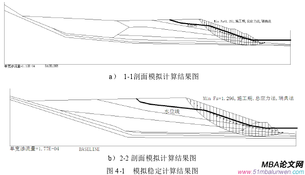 通過第 3.4 節的研究,可知影響尾礦庫防洪能力的因素有:a.排洪系統的完好性。排洪系統是否通暢,能否滿足排洪要求,及時排空洪水,都將直接影響尾礦庫的防洪能力;b.尾礦庫庫水位。尾礦庫的庫水位直接影響調洪庫容的大小,汛期如未按設計騰出調洪庫容,將會導致洪水位迅速升高,排洪系統壓力增大,可能發生洪水漫頂現象;c.干灘長度、安全超高和沉積灘坡度。這三者相互影響,在干灘長度相同情況下,安全超高較小,就意味著沉積灘坡度緩,影響尾礦庫的防洪能力;當安全超高相同的情況下,干灘長度短,也意味著沉積灘坡度較陡;在沉積灘坡度相同的情況下,安全超高小,也意味著安全超高小,對尾礦庫防洪不利。通過第 3.5 節的研究,可知影響尾砂壩穩定性的因素有[42]:a.庫區的工程地質條件。進行加高尾礦壩時,需對工程地質條件進行分析[43]。b.尾砂的性質,尾砂透水性能影響著浸潤線的埋深,不同性質的尾砂,凝聚力和摩擦角也不同[44]。c.尾礦壩的外坡比,當堆積壩外坡比小時,容易造成局部失穩。d.浸潤線的埋深[45]。可以通過計算實例進行說明。在實例尾砂庫總壩高為 36m 情況下,如庫水位取規范要求的最小干灘長度 50m對應的庫水位,浸潤線埋深模擬提升至規范要求最小埋深 4.0m,采用 AutoBank 軟件,對尾礦庫 1-1 剖面和 3-3 剖面進行模擬計算,其他計算參數不變。計算結果如圖4-1。計算表明,此時尾砂壩 1-1 剖面的安全系數降至 1.251,3-3 剖面的安全系數降至 1.296,安全系數減小比較明顯,且滑動面畢竟較大,影響程度較廣。為此浸潤線也被稱為尾礦庫的“生命線”[46]。