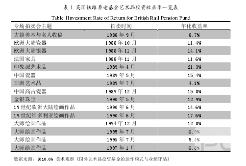關于藝術品的投資價值一直是學術界爭論的焦點,由于藝術品交易信息不透明,且藝術品的收藏期限較長,故很難全面追溯藝術品的交易記錄來分析其收益率。自 20 世紀 70 年代至今,多位學者通過交易追溯的方法試圖建立有效的樣本集合,從而分析藝術品投資價值。但由于樣本量不充分及樣本選擇偏差等原因,各位學者得出的結論迥然不同:有的認為藝術品沒有投資價值,從長期來看其收益率低于國債;有的則認為藝術品具有較高的投資價值,其收益率高于債券甚至股票。然而,隨著藝術品交易市場的不斷規范,拍賣行的交易記錄逐步完善,藝術品投資的研究數據越來越全面,各種藝術品指數相繼出現,使得藝術品的價值研究更有說服力。因此,本文將以實例說明和指數分析相結合的方法研究藝術品的投資價值。 回顧藝術品投資歷史,英國鐵路養老基金的成功一直為收藏界津津樂道。從其公布的英國鐵路養老基金藝術品專場拍賣會收益率數據來看(如表 1 所示),英國鐵路養老基金投資組合的平均年收益率約為 13%,其中印象派藝術品、中國瓷器、中國高古瓷器以及 19 世紀維多利亞繪畫作品的年化收益率超過 15%,投資回報最差的非洲藝術品也有 4.1%的年化收益率。除英國鐵路養老基金外,由佳士得拍賣行前任財務經理菲利普 霍夫曼創建的英國美術管理服務有限公司也有不俗的業績。2003 年至 2007 年,英國美術管理公司旗下的美術基金平均收益率高達 50%。但另一方面,慘遭滑鐵盧的藝術品投資基金也不在少數。1989 年,大通藝術基金(首支在金融界建立的藝術品投資基金)通過巴黎銀行基金投資 2200 萬美元,購買 16 幅法國及意大利的繪畫及素描作品。但由于收藏成本過高;藝術品價格下滑等原因,7 年后基金退出時損失高達 800 萬美元(約為初始投資金額的 40%)。此外,投資失敗的案例還包括 Morgan Grenfell 發售的 2500 萬美元的藝術品投資基金,日本 Itoman Mortgage Corporation 投資 5.2 億美元購買的 7300 件西方現代主義及印象派的繪畫作品等。由此可見,藝術品雖然具有很高的投資價值,但同時伴隨明顯的投資風險,歷史經驗表明藝術品投資收益率有很大的波動性。