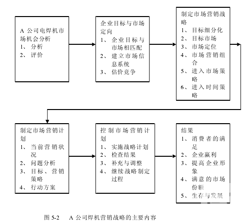 營銷戰略,是企業為實現各種特定的營銷目標[1]。實現自身生存和發展而選擇和制定的行為綱領或方案。如何讓企業利潤增加,擴大市場份額,這就必須要實施科學的營銷戰略。整合 A 公司焊機市場營銷管理過程(見圖 5-1)是一個業務戰略過程,它的制定、執行是可評價協調和可測度的。A 公司電焊機具體的營銷戰略可以用以下表現(見圖 5-2),它表明了市場營銷過程中復雜變量間的關系。 市場營銷策略是一個企業市場營銷戰略的核心部分,企業應隨時調整營銷組合因素,各種因素協調配合、采取協調一致的行動,才能發揮整體功能。在做出準確有市場定位之后,下面針對 A 公司營銷策略中產品、價格、促銷、渠道中存在的問題進行研究,對 A 公司營銷策略進行優化。