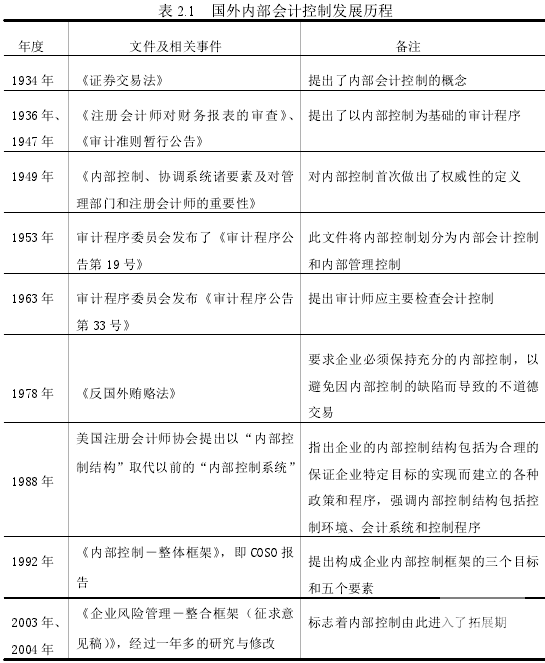 國外內部會計控制發展起步早,經過多年的發展,內部會計控制發展相對成熟,其歷程如下表 2.1 所示,