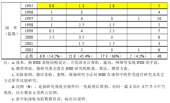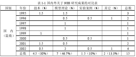 表 1-1是 1995 年到 2002 年國(guó)內(nèi)外關(guān)于NSS研究成果的對(duì)比表,客觀反映了NSS的研究現(xiàn)狀及發(fā)展方向。