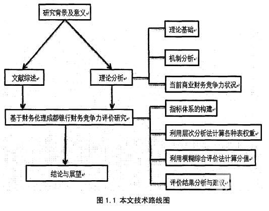 本文的研究思路是在對相關文獻進行歸納梳理的基礎上,提出本文的研究方向。本文在對理論進行分析的基礎上,構建了基于財務倫理的商業銀行財務競爭力評價指標體系,基于層次分析法以成都銀行為例進行了研究,最后提出對策及建議以及后期研究展望,本文研究思路如下圖1.1所示: