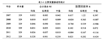 主要變量分年度的描述性統(tǒng)計如表5-1所示,可以看出:(1)會計盈余各年的巾值均小于均值,表示NI是右偏的;(2)股票回報率各年的中值也是小于均值的,表示股票回報率也是右偏;(3)同一年度來看,2007年會計盈余的標(biāo)準(zhǔn)差0.085小于股票回報率的標(biāo)準(zhǔn)差1.22; 2008年會計盈余的標(biāo)準(zhǔn)差0.037小于股票冋報率的標(biāo)準(zhǔn)差0.363;2009年會計盈余的標(biāo)準(zhǔn)差0.090小于股票回報率的標(biāo)準(zhǔn)差0.529; 2010年會計盈余的標(biāo)準(zhǔn)差0.055小于股票回報率的標(biāo)準(zhǔn)差0.518; 2011年會計盈余的標(biāo)準(zhǔn)差0.057小于股票回報率的標(biāo)準(zhǔn)差0.167;只有2012年會計盈余的標(biāo)準(zhǔn)差0.918小于股票回報率的標(biāo)準(zhǔn)差0.282:說明相對丁?會計盈余來說,股票回報率的波動性更大。圖5-1顯示了會計盈余和股票收益率2007-2012年度趨勢圖。圖中顯示,股票收益率有較大波動2007年為最高點為0.637,然后一路下滑,跌至2009年的谷底-0.784后開始回升,但一直處于波動狀態(tài)。上市公司會計盈余較為穩(wěn)定,2007-2011年比較平穩(wěn),2012年升至趨勢由2011年的0.026升至2012年的0.328。