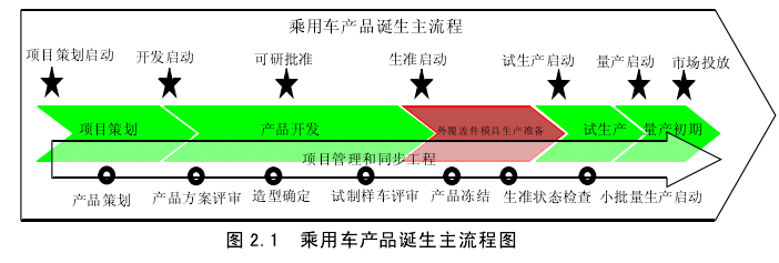 生產準備管理的主要內容是在保證產品符合設計的前提下,進行合理的資源利用、物流規劃、成本控制、技術裝備、工藝制造方法、人員配備等準備工作,使產品制造能力和質量達到設計要求的全部過程。由于本文主要是以 YQJC公司為背景,故其自主品牌產品開發過程中的沖壓工藝生產準備管理主要有以下幾個主要內容: 1、生產準備 BOM:也稱為工藝制造設計零件明細表。它用于工藝設計和生產制造管理,使用它可以明確地了解零件與零件之間的匹配關系。 2、白車身匹配活動(PCF-Product Content Fix):為滿足白車身尺寸精度標準,通過對白車身零(合)件進行匹配,達到白車身尺寸精度標準,而進行的質量培育過程。 3、整車匹配活動(UCF-Unit Content Fix):為滿足整車尺寸精度標準,通過對總裝零(合)件進行匹配,達到整車尺寸精度標準,而進行的質量培育過程。 4、試生產(TTO-Tooling Try Out):工藝調試,安排在 PP 生產之前。主要任務是利用單件和總成工裝來檢驗工序及設備的工藝能力,通過調試達到質量目標,同時起到培訓操作者及檢查員操作能力的作用。 5、小批量生產(PP-Pilot Production):工藝調試完畢之后,正式生產前,在正式工裝條件下的批量試生產階段。主要任務是:檢驗零件的供貨能力、檢驗質量穩定性、檢驗設備通過能力、設備、工裝優化、工藝文件定稿。 6、量產(MP- Mass Production):根據生產計劃生產大批量的產品。下圖2.1 為外覆蓋沖壓件模具生產準備在乘用車產品誕生主流程里所處的位置: