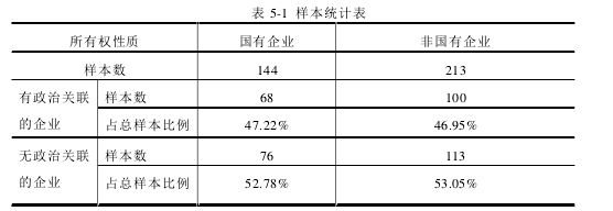 本文選取 2013 年中國滬深股市發(fā)生的股權(quán)并購交易事件中的并購標(biāo)的公司為初始樣本,并以 2012 年、2014 年的相關(guān)數(shù)據(jù)分別作為并購前后指標(biāo)參與實證檢驗,為確保數(shù)據(jù)的有效性,滿足研究的需要,本文按以下原則對樣本進(jìn)行了篩選: (1)剔除并購交易沒有成功的; (2)剔除并購規(guī)模小于并購標(biāo)的公司總資產(chǎn)的 5%的; (3)剔除并購一方為金融、保險行業(yè)的; (4)剔除相關(guān)數(shù)據(jù)缺失或異常的; 按照上面提到的要求對初始樣本進(jìn)行篩選后,本文最終得到 2013 年滬深股市 357 個并購事件為有效研究樣本,具體情況如表 5-1 所示: 從表 5-1 可以看出,隨著全球并購浪潮的不斷推進(jìn),2013 年我國很多企業(yè)參與到了并購活動中。從并購活動中并購標(biāo)的方的所有權(quán)性質(zhì)來看,非國有企業(yè)多于國有企業(yè)。這一情況的出現(xiàn)可能與我國國有企業(yè)的特殊性分不開,國有企業(yè)比非國有企業(yè)承擔(dān)更多的政策性任務(wù),以并購標(biāo)的角色出現(xiàn)在并購活動中的概率可能更低。同時,近年來,非國有企業(yè)發(fā)展迅速,積極開展并購活動,有報道指出,非國有企業(yè)已成為海外并購的主力軍45。筆者發(fā)現(xiàn),無論是國有還是非國有企業(yè),有政治關(guān)聯(lián)的企業(yè)的比例都接近 50%,這說明政治關(guān)聯(lián)普遍存在于我國的上市企業(yè)中。 本文的數(shù)據(jù)主要來自國泰安數(shù)據(jù)庫(CSMAR)。其中并購交易數(shù)據(jù)來源于CSMAR 的中國上市公司并購重組研究數(shù)據(jù)庫;上市公司的財務(wù)數(shù)據(jù)來自CSMAR 的中國上市公司財務(wù)報表數(shù)據(jù)庫;上市公司的所有權(quán)性質(zhì)來自 CSMAR的中國上市公司股東研究數(shù)據(jù)庫。對于上市公司高管的政治關(guān)聯(lián)數(shù)據(jù)主要是通過手工搜索獲得。具體的工作是先通過查閱 CSMAR 中高管的個人簡介并結(jié)合和訊財經(jīng)中高管的個人簡介,然后通過百度搜索引擎核實數(shù)據(jù)。本文中的數(shù)據(jù)是通過EXCEL 進(jìn)行初步處理,描述性統(tǒng)計分析、多元回歸分析和 t 檢驗分析通過 STATA12.0 予以完成。為了消除極端值的影響,對處于 0-1%和 99-100%之間的樣本數(shù)據(jù)進(jìn)行 Winsorize 處理。