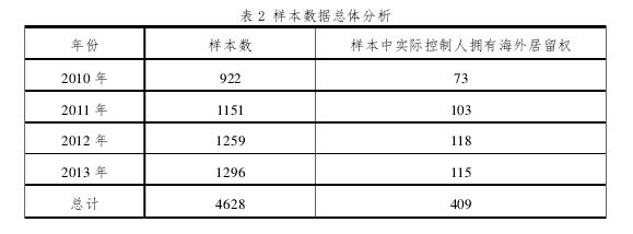 本文研究的目的在于研究上市民營企業(yè)家擁有海外居留權(quán)對公司價值的影響及其影響機理。論文選取的研究樣本為 2010 年、2011 年、2012 年、2013 年的民營上市公司。 在樣本初期,文章收集了 2010-2013 年 4 年的上市公司的數(shù)據(jù)和信息,并明確文章研究對象主要針對民營企業(yè)實際控制人在國內(nèi)創(chuàng)業(yè)并且企業(yè)在國內(nèi)上市之后擁有海外居留權(quán)這一情況對公司價值的影響。基于此,①在基礎(chǔ)數(shù)據(jù)庫中首先篩選刪除非民營企業(yè),在非民營企業(yè)之中,可以預(yù)見的是大部分為國有企業(yè),其中不乏中央企業(yè),國資委和地方國資委控制的企業(yè)以及中央部門地方部門控制的企業(yè)。②在第一步驟的基礎(chǔ)上進一步篩選,刪除的重點為中國部分大學(xué)控股的企業(yè)以及實際控制人為集團公司的上市企業(yè),集團公司為實際控制人的上市企業(yè)無法得知其真正的實際控制人信息,同時將實際控制人不存在的企業(yè)也刪除。③在第二步的基礎(chǔ)上,篩選刪除國外華僑以及國外集團公司、國外友人在中國大陸上市的企業(yè),這部分人群的動機與文章要研究的民營企業(yè)家移民群體的動機有所區(qū)別,這部分人群大多看好國內(nèi)投資環(huán)境然后在國內(nèi)投資創(chuàng)業(yè)并上市,其中尤以來自港澳臺地區(qū)的實際控制人為多。④在剩下的擁有海外居留權(quán)的上市公司樣本中主要為國內(nèi)創(chuàng)業(yè)并且企業(yè)在國內(nèi)上市的企業(yè),為了區(qū)分動機進一步篩選刪除是否在國外留過學(xué),并且將在國外留學(xué)的實際控制人樣本刪除。⑤對個別樣本進行判斷并篩選刪除或者保留。在前面四步的篩選工作之后具體的研究樣本見表 2。