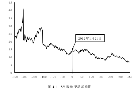 備受大家格外關注的SY公司并購DX是我國金額較大的海外并購案例。一直以來,在海外并購案例中,成功的案例非常少,尤其這種小魚要成功吞下大魚的案例就更少。SY 與 DX 之間的并購交易是否免除了失敗的鐐銬,無法過早的下結論。但是面對縱橫交錯的棘手問題如管理、資金、市場等難題,對于急于爭奪世界市場的 SY 公司而言,一切才剛剛開始且任道而重遠。下面,我們先采用事件分析法粗看下資本市場的反應。首先有必要回顧一下 SY 公司股票價格在發生并購前后各一年的大體走勢。以 2012 年 1 月 21 日為并購當天,即為第 0 天,明確地描述了在并購前后一年 SY公司股票價格的變動趨勢,其中并購宣布日第-180 天左右 SY 公司股票價格達到歷史巔峰。2011 年底,SY 將宣布并購 DX 的第-40 天左右,SY 公司股價開始大幅下降,并且出現連續下跌后略微反彈.