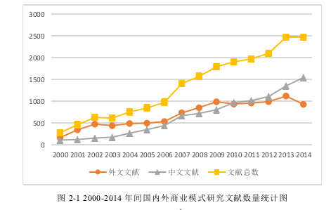 基于對文獻檢索平臺的權威性及其對數(shù)據(jù)庫與期刊的涵蓋率等因素的考慮,本文選取“ISI Web of Science”作為英文文獻檢索平臺,選取“中國知網(wǎng)”(CNKI)作為中文文獻檢索平臺,以“商業(yè)模式(Business Model)”為主題詞,時間跨度為2000 年到 2014 年,共檢索到文獻 20269 篇,其中外文文獻 10464 篇,中文文獻9805 篇。根據(jù)檢索結果,繪制出 2000-2014 年間國內(nèi)外商業(yè)模式研究文獻數(shù)量統(tǒng)計圖(圖 2-1),從圖 2-1 中可以看到,關于商業(yè)模式的研究成果在這十幾年間飛速增加,從 2000 年的 276 篇上升到 2014 年的 2475 篇。對比外文文獻和中文文獻的折線圖可以發(fā)現(xiàn),國內(nèi)對商業(yè)模式的研究滯后于國外,但從 2010 年開始,國內(nèi)每年關于商業(yè)模式的文獻數(shù)量已經(jīng)超過了國外,至于質(zhì)量如何需要進一步地分析。此外,觀察外文文獻數(shù)量的折線圖可以發(fā)現(xiàn),從 2009 年開始,國外每年關于商業(yè)模式的文獻數(shù)量保持穩(wěn)定,說明國外對于商業(yè)模式的研究開始進入冷靜期。