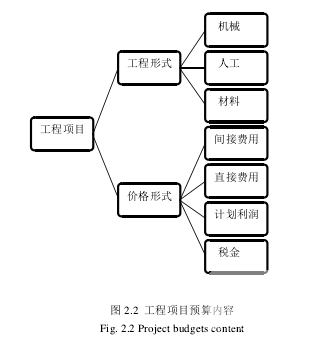 在一般的企業(yè)中,首先是簽訂合同,委托方以認(rèn)為合理的價(jià)格選定施工方,施工方在保證工程順利完工的基礎(chǔ)上讓自己獲得合理的利益。施工方在做項(xiàng)目預(yù)算時(shí),必須要知道具體施工過(guò)程,算出合理的資金需求量,同時(shí)也要制定出如何分配所得資金,如何有效的利用這筆資金,使資金實(shí)現(xiàn)最大效益。在施工過(guò)程中要保證既不會(huì)造成資金鏈的中斷,也不能預(yù)留過(guò)多的資金。 工程項(xiàng)目是一個(gè)復(fù)雜的系統(tǒng),為了使施工企業(yè)預(yù)算方便,可將項(xiàng)目工程預(yù)算的內(nèi)容大致分為兩中形式,如圖 2.2 所示。預(yù)算書中分別以工程形式和價(jià)格形式表現(xiàn)出具體的工程量與價(jià)值。以工程形式來(lái)劃分,其中,機(jī)械費(fèi)用主要包括在施工的過(guò)程中,設(shè)備租賃費(fèi)、消耗費(fèi)、修理費(fèi)、施工機(jī)械的進(jìn)出場(chǎng)費(fèi)、轉(zhuǎn)移費(fèi)以及裝卸費(fèi)。人工費(fèi)主要包括不同工種的工人價(jià)格以及參與項(xiàng)目人員的獎(jiǎng)金、津貼等。材料費(fèi)用包括實(shí)際工作中所需要的原材料、零件、配件、半成品以及運(yùn)輸與存儲(chǔ)、消耗的費(fèi)用。 如果以價(jià)格形式表現(xiàn),那么工程項(xiàng)目的成本可以分為固定費(fèi)用和可變費(fèi)用。企業(yè)的管理費(fèi)用、固定資產(chǎn)折舊費(fèi)以及職工的培訓(xùn)費(fèi)等,這樣不會(huì)隨著工程量的增加而增加的資金叫做固定成本。相反的,隨著工程量的增加而增加的成本叫做可變成本,它主要有材料、現(xiàn)場(chǎng)經(jīng)費(fèi)、臨時(shí)設(shè)施費(fèi)、財(cái)務(wù)費(fèi)用、冬、雨季施工增加費(fèi)、夜間施工增加費(fèi)、所得稅、特殊地區(qū)施工津貼費(fèi)等。