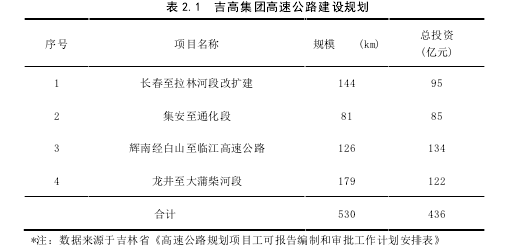 我國高速公路公司的歷史,要追溯到 20 世紀 90 年代初。在此之前,地區的高速公路建設,一般歸屬于交通廳管理。高速公路公司的成立,符合政企分離的政策,并且在一定程度上使得管理更加科學化、專業化。吉林省高速公路集團有限公司便是在此背景下成立的。吉林省高速公路集團有限公司,原名吉林省高速公路公司,于 1993 年成立,隸屬于吉林省交通廳管理,公司注冊資本為 27 億元人民幣。經營范圍為:高速公路開發建設、管理和養護;房屋租賃;機械設備租賃;五金建材、機電設備、汽車配件、瀝青、日用百貨和服裝;住宿、餐飲、汽車維修、石油及成品油以及食品銷售;設計、制作、代理國內各類廣告業務;發布路牌、燈箱、霓虹燈廣告業務及進出口貿易。 吉高集團是依照《中華人民共和國公司法》設立,由吉林省政府批準成立的國有獨資公司。由吉林省政府授權省交通運輸廳、省財政廳出資,由該公司行使國有資產投資主體權和國有資產經營權,依法對所授權投資、經營的國有資產行使占有、使用、處置、收益的權力,在省交通運輸廳、省財政廳的監管下,承擔國有資產保值增值的責任。 吉高集團的宗旨是按照國家法律、法規和政策的要求以及市場化經營的原則,運用政府授權投資經營職能,搭建投融資平臺,廣泛吸收和運用國內外資金,優化吉林交通資產管理,盤活存量資產,多渠道籌集資金,以適應吉林省國民經濟和社會發展的需要,促進吉林省交通事業持續健康穩定發展。其作為一個投資主體,對吉林省高速公路的建設規劃在戰略層面進行指揮與決策;其作為一個融資主體,依靠其融資平臺的巨大優勢,對外籌集資金,進行統籌、協調,確保高速公路的建設與運營。
