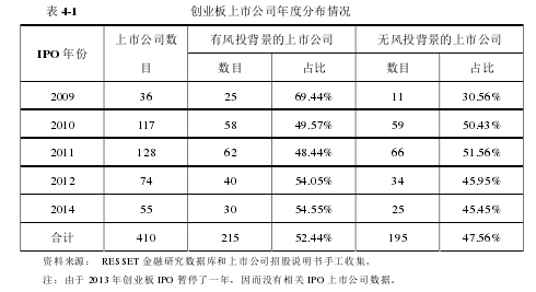 表 4-1 描述創業板上市公司 2009-2014 各年度 IPO 分布情況,以及有無風險投資背景的 IPO 公司占比情況,我們可以看出,在 410 家上市公司中,有風險投資背景的上市公司占了 215 家,超過了一半,說明了我國風險投資機構比較偏愛創業板,這主要是由于我國創業板主要都是一些成長性好和高科技創新的中小企業組成,投資回報高,與本文開始時所論述的觀點一致,用具體數據解釋了本文選擇創業板來研究風險投資的原因。具體到各年度來看,2009 年有 36 家公司在創業板上市,雖然上市數量較其他年度偏少,但考慮到 2009 年 10 月份創業板才開閘,其數目已相當可觀,同時我們注意到,2009 年風險投資機構背景的上市公司占比最多,達到了 69.44%,遠遠超過了沒有風險投資背景的上市公司,這主要是由于 2009 年我國創業板市場剛剛成立,首批上市的企業質量較高,投資前景好,從而吸引了大量風險投資前來參與的原因。2010-2014 年度有無風險投資背景的上市公司基本上各占一半,這與樣本總體的占比一致,其中 2011 年上市公司數目達到最高,為 128 家,2013 年由于創業板 IPO 暫停了一整年,因而沒有公司上市。