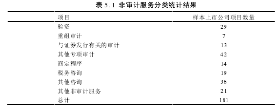 本文首先對樣本上市公司購買的非審計服務的類型進行了統計。非審計服務中除財務報表審計和內控審計以外的鑒證服務包括:驗資、重組審計、與證券發行有關的審計服務以及其他專項審計服務,非鑒證服務包括:商定程序、稅務咨詢、內控咨詢等其他咨詢以及其他非鑒證業務。由上表可以看出,在鑒證業務中,樣本上市公司購買注冊會計師驗資服務的數量較多,另外其他專項審計項目數量較多,由于許多公司只披露了購買注冊會計師專項審計服務的費用,而沒有明確具體的專項審計服務類別,本文將這種情況的樣本上市公司分類為購買其他專項審計服務的公司,因此其他專項服務的數量較多。而在非鑒證服務當中,樣本上市公司購買咨詢服務的數量較多,可見上市公司對注冊會計師非鑒證業務的需求以咨詢為主,其中稅務咨詢的需求較多,對于內部控制等咨詢的需求也同樣存在。由于有的上市公司同時購買了多項非審計服務,在統計的過程中樣本有重復計入的情況,因此,購買非審計服務項目的總計數多于樣本上市公司數量。