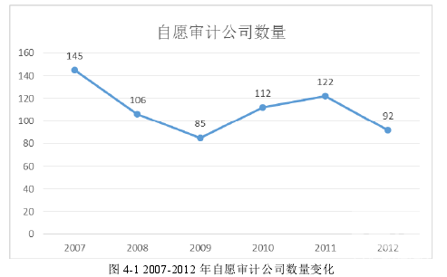 考慮到滬深兩市交易所在2006 年和2012年都對中期財務(wù)報告審計制度進(jìn)行了修訂,為了控制制度背景的變化對樣本選擇的影響,我們以 2007-2012 年進(jìn)行中期財務(wù)報告自愿審計的滬深兩市 A 股主板公司為自愿審計樣本。 基本的樣本選擇思路是:先找到 2007-2012 年所有進(jìn)行過中期財務(wù)報告審計的公司,再從這些公司中減去中期財務(wù)報告強制審計的公司。選取強制審計公司是以符合論文第二章制度背景中證監(jiān)部門規(guī)定的上市企業(yè)中期財務(wù)報告強制審計的條件為標(biāo)準(zhǔn),選擇出符合監(jiān)管部門的中期財務(wù)報告強制審計要求而被強制進(jìn)行審計的樣本為強制審計公司。其次,我們在所選擇出的中期財務(wù)報告自愿審計樣本中減去國泰安(CSMAR)數(shù)據(jù)庫中數(shù)據(jù)缺失的樣本(考慮研究樣本一致性的條件),剔除了 ST、PT 和金融類上市公司(這些公司與其他公司在治理結(jié)構(gòu)、金融模式及盈余模式等方面差別很大,不滿足樣本的代表性原則)。 最后,得到中期財務(wù)報告自愿審計過的公司共 662 家,其中 2007 年 145 家,2008 年 106 家,2009 年 85 家,2010 年 112 家,2011 年 122 家,2012 年 92 家。圖 4-1 展示了 2007-2012 年自愿審計公司的數(shù)量變化,可見我國自愿審計公司的數(shù)量在 2007-2009 年是連續(xù)下降,在 2010-2012 年又有所上升。特別是 2009 年進(jìn)行自愿審計的上市公司數(shù)量為這個階段的最低點,產(chǎn)生這種現(xiàn)象的原因極可能與 2008 年的全球性金融危機有著千絲萬縷的聯(lián)系。金融危機導(dǎo)致了公司業(yè)績的下滑,讓投資者對公司未來的前景失去了信心。所以,投資者對外部審計需求會受到經(jīng)濟(jì)環(huán)境的影響。總體來說 2007-2012 年每年進(jìn)行自愿審計公司的數(shù)量保持在 110 家左右。