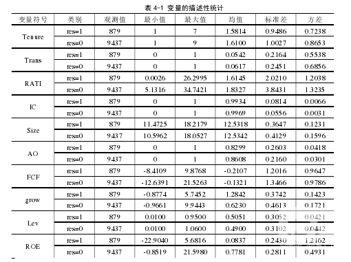 本文將發生了會計重述行為,包括發生差錯、更正差錯和發生并更正差錯歸為重述組(res=1),將未發生會計重述,即既未發生會計差錯也未更正前期差錯的樣本歸為未重述組(res=0)。為了更加清晰的明確各上市公司審計質量情況,充分了解影響審計質量的各項因素,并為后續的相關性檢驗和多元回歸分析提供參考依據,本文對所有有效樣本的變量按照如上分組標準進行了描述性統計,如表 4-1 所示:如表 4-1 所示,我國上市公司注冊會計師審計任期(Tenure)的均值在重述組和未重述組分別為 1.5814 和 1.6100,其標準差在重述組和未重述組分別為 0.9486 和 1.0027,說明會計重述公司的注冊會計師審計任期不合理,造成這種不合理的原因可能是任期過長,可能是任期過短,也有可能是受到過渡審計師的影響,具體最佳的審計任期為多久,在下文進行回歸分析時會詳細說明。本文對過渡審計師(Trans)的衡量采用的是虛擬變量,其均值大小說明了該變量占全部樣本量的比重。由上表可以看出,過渡審計師這一變量在重述組和未重述組的均值分別為 0.0542 和 0.0617,這說明該變量在樣本總體在所占比重很小,進而說明了上市公司在強制輪換制度實施過程中是否存在過渡審計師,對審計質量的影響不大。本文對于非審計服務(NAF)采用當年實付非審計費用占非審計服務費用與審計服務費用總和的比重(RATI)來衡量,其最大最小值之間的差異在重述組和未重述組都表現的比較明顯,這種差異在一定程度上會影響審計質量。本文對于內部控制(IC)的衡量也采用的是虛擬變量,其均值大小同樣說明了它占全部樣本的比重,由上表可以看出,內部控制這一變量在重述組和未重述組的均值分別為 0.9934 和 0.9969,這說明該變量在樣本總體在所占比重很大,進而說明了上市公司內部控制制度是否健全對審計質量的影響很大。