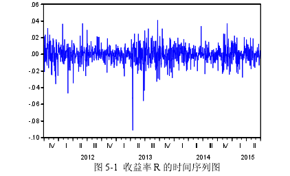 本文采用的數(shù)據(jù)是倫敦黃金現(xiàn)貨每日收盤價(jià)格。數(shù)據(jù)區(qū)間為紫金礦業(yè)收購左岸金礦項(xiàng)目后的時(shí)期至今,即紫金礦業(yè)持有該項(xiàng)目的時(shí)間 2011/09/29 日到 2016/05/02 日,扣除非營業(yè)日,共有 1165 個數(shù)據(jù)。其中選取 2011/09/29-2015/06/30 日共 977 個數(shù)據(jù),用于構(gòu)建 GARCH-Va R 模型和確定模型的估計(jì)參數(shù),剩余 2015/06/30-2016/05/02 日的共 219 個數(shù)據(jù),用于檢驗(yàn)構(gòu)建的 GARCH-Va R 模型的有效性。數(shù)據(jù)來源是大智慧軟件。采用 Eviews8.0 軟件對數(shù)據(jù)進(jìn)行處理。采用 Eviews 軟件計(jì)算得出黃金現(xiàn)貨收益率序列如下圖。從圖中可以看出 LME 黃金現(xiàn)貨收益率序列 R 的波動總體較為平穩(wěn),但是也可以經(jīng)常觀測到異常值的出現(xiàn)且次數(shù)較為頻繁,可以認(rèn)為該序列存在集聚性和爆發(fā)性,屬于隨機(jī)序列。對黃金現(xiàn)貨收益率序列進(jìn)行進(jìn)一步處理,對數(shù)據(jù)的統(tǒng)計(jì)特征進(jìn)行進(jìn)一步觀察。得到收益率的柱形統(tǒng)計(jì)圖。從圖中可以看出黃金現(xiàn)貨的對數(shù)收益率序列的均值(mean)是-0.000327,標(biāo)準(zhǔn)差(Std.Dev.)是 0.010671。同時(shí)從收益率序列的偏度(Skewness)-0.904481,看出收益率序列有長的左拖尾。而峰度(Kurtosis)10.48776,大于 3,表明分布突起程度大于正態(tài)分布,說明該收益率序列的分布具有 “尖峰后尾”特征。J-B 統(tǒng)計(jì)檢驗(yàn)得出該收益率序列拒絕服從正態(tài)分布的假設(shè)。