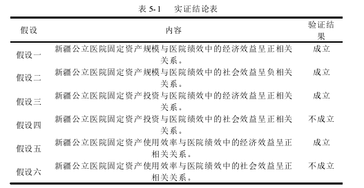 本文通過對新疆公立醫院固定資產投入、使用效率與醫院績效影響的研究,提出本文研究假設,并運用描述性統計、因子分析法、回歸分析法,進行實證研究,得出本文的主要結論為下表所示:  假設四不成立的原因可能是因為在購置新的固定資產時,因為醫院專業設備昂貴,新疆公立醫院為了長遠發展,不斷提升經濟效益,可能會提高醫療收入來彌補購買固定資產的巨大成本,從而使患者支付醫藥費用的負擔加重,降低了社會效益,使得本文假設三的結果與預期不符。     假設六中衡量新疆公立醫院固定資產使用效率的三個指標中,病床使用率、與百元固定資產醫療收入變量估計系數均為正,T 統計量均在 1%的顯著性水平下通過了檢驗,但病床周轉次數變量的系數為負,與預期不符,使得假設六不成立,可能是因為病床周轉次數并不能簡單的認為越高越好,如果病床周轉次數過高,說明病人住院時間短,病床周轉快,如果過快可能會加大衛技人員的工作量,導致沒有充足的時間為每張床做好消毒處理,從而使醫院的服務質量下降,影響醫院績效中的社會績效。根據徐國光在《中國醫院管理制度全集》一書中認為,病床周轉次數應大于 17 次/年,新疆公立醫院 2010年至 2013 年的病床周轉次數平均值為 36.65 次/年,達到一般標準的兩倍多,周轉過快。造成使用效率高,社會效益卻不高的狀況,還有可能是衛技人員為了完成治愈率這一考核指標,動員部分未痊愈的患者出院,這也會造成使用效率高,社會效益卻不高的狀況。這些都可能是假設六不成立的原因。