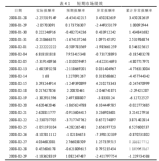 本文采用事件研究法來探討公司披露整體上市信息的短期市場效應。事件研究法是探討股價波動與市場某一事件之間相關性的一種統(tǒng)計方法,主要用于反映股價對信息披露的反應程度。在具體操作上,主要是通過異常報酬率(abnormal returns)的計算和分析來體現(xiàn)事件是否造成股價波動,進而以此判斷事件對于公司短期市場績效的影響。 本文通過對鹽湖鉀肥披露整體上市草案前后其股票的異常報酬率(AR)的計算分析,研究上市公司公告整體上市信息這一事件是否能夠如理論預期一樣給上市公司帶來正向市場績效。若股票的異常報酬率為正,則表明投資者看好企業(yè)整體上市帶來的收益,表明整體上市具有正向財富效應;反之,如果股票的異常報酬率為零或為負,那么就可以說明整體上市的市場反應為負向的,市場上的投資者并不看好整體上市對企業(yè)的影響,以致股價下跌,整體上市的公告效應為負。