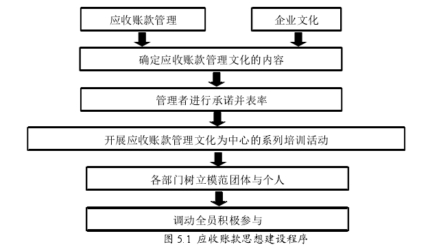 應收賬款的管理是一個系統工程,一個有效的應收賬款管理系統的實施必須要的到管理層的支持,管理層決定了應收賬款的管理高度,與管理的目標、政策、方針息息相關,應收賬款管理工作需要銷售部門、信用部門相互協作,全員參與。青島 SX 輪胎公司管理層對銷售部門的要求主要銷售額的提升,因銷售產生的應收賬款的風險管理意識薄弱,為了更好地實施青島 SX 輪胎公司的應收賬款管理改進方案,應在公司內部推行應收賬款管理文化,從上到下、由略到詳的逐步推行,提升應收賬款風險防范理念。青島 SX 輪胎公司應收賬款管理的文化建設步驟見圖5.1。應收賬款管理文化的推進首先要引起管理層重視,將應收賬款管理的重要性與必要性以文字方式融入到公司的管理方針中去,由信用管理部門的信用管理專業人員向銷售部門。財務部門以及信用管理部門開辦專題講座,并傳達相關的政策,提高應收賬款管理專業知識的同時,調動員工自覺參與、監督應收賬款風險管理意識。