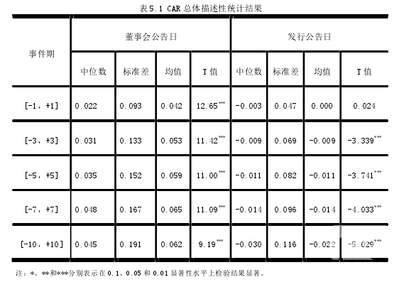 本文首先對 CAR 總體進行了描述性統計以及單變量 T 檢驗,檢驗結果如表 5.1所示。從表 5.1 可以看出以下兩點: (一)首次向市場宣告實施定向增發會有正的公告效應。董事會公告日在事件期為[-1,+1]、[-3,+3]、[-5,+5]、[-7,+7]、[-10,+10]的 CAR 均值均為正數且顯著,這也再次驗證了上市公司宣告定向增發,市場會有積極的反應。相較之下,事件期為[-7,+7]時的均值最大,說明市場在董事會公告實施定向增發后的 7 天反應最為強烈。 (二)發行公告日的 CAR 均值除了在事件期為[-1,+1]時是正值外,其他事件窗口均為負值且顯著,說明市場整體對上市公司已經完成定向增發的反應并不積極。對比樣本 0 和樣本 1 在首次公告日和發行公告日各自事件窗口的 CAR 均值及差異,結果表明在董事會首次公告日的各個事件窗口,樣本 0 的 CAR 均值和樣本 1 的CAR 均值均為正,且樣本 0 的 CAR 均值要顯著高于樣本 1 的 CAR 均值,在期間[-7,+7]的差異達到最大。這種顯著性差異從事件窗口為[-1,+1]、[-3,+3]及[-5,+5]的 P值單邊檢測達到 1%顯著性水平、事件期為[-7,+7]、[-10,+10]的 P 值單邊檢測達到5%顯著性水平可以看出,說明在董事會公告日,沒有機構投資者參與的定向增發公告效應要明顯好于有機構投資者參與的定向增發。這一結論證明假設一并不成立,但還需進一步檢驗。另外,從在發行公告日的 CAR 均值對比結果上可以看出有機構投資者參與的定向增發要低于沒有機構投資者參與的定向增發 CAR 均值,但這種差異并不明顯,差異均值基本在千分位,且除[-1,+1]事件期外,單邊檢測 P 值均未達到10%顯著性水平。
