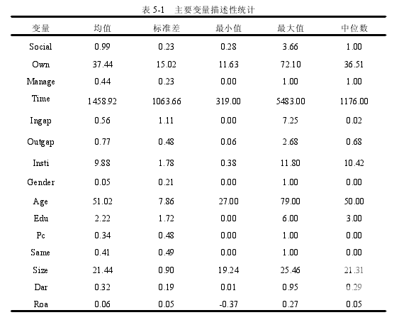 表 5-1 是對 3095 個上市家族企業樣本觀察值的描述性統計結果,主要把握變量的分布狀態及主要特點,包括均值、標準差、最值和中位數。通過表 5-2 可以看出,家族涉入的三個代理變量均與社會責任履行度呈顯著正相關關系。具體而言:家族所有權、家族控制時間在 1%的水平上對社會責任履行度有顯著的正向影響;家族控制權則在 5%的水平上對社會責任履行度有顯著的正向影響,本文假設 1 得到初步驗證,調節變量內部期望績效壓力、資本市場績效壓力均在 1%的水平上對社會責任履行度有顯著負向影響。董事長個人特征層面:僅董事長年齡在 1%水平上對社會責任履行度有顯著負向影響;年齡、教育以及政治身份對社會責任履行度有正向影響,但相關性水平并不顯著;董事長兼任總經理的情況則對社會責任履行度有不顯著的負向影響。企業層面:企業規模、資產負債類在 1%水平上對社會責任履行度有顯著的正向影響;而資產收益率也在 1%水平上對社會責任履行度有顯著的負向影響。